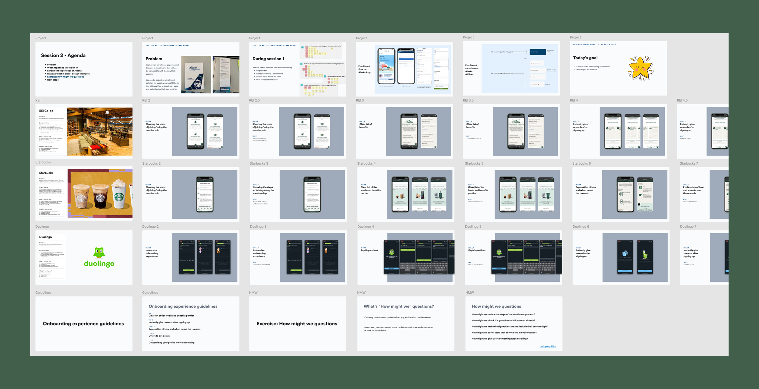 We reviewed identified problems, summarized Session 1, and discussed the existing enrollment experience. Looking at "best-in-class" onboarding examples helped guide our thinking. I then facilitated a "How Might We" exercise to brainstorm creative solutions for our challenges.