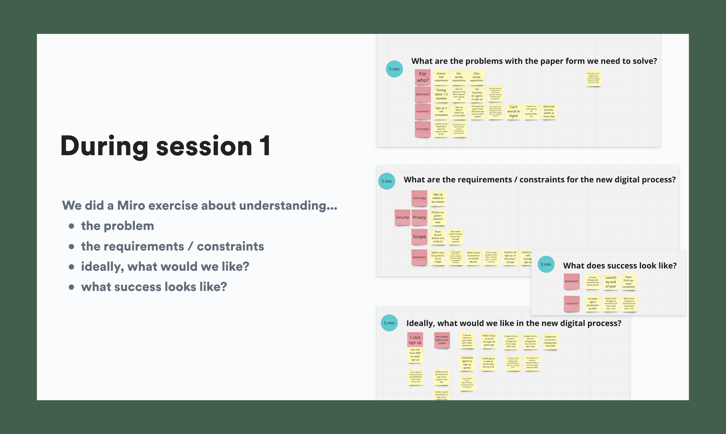 I led a card sorting exercise asking: "What are the problems with the paper form we need to solve?" People talked about each problem for a few minutes based on who it affected: the user, the business, the overall experience, or the technology. We also talked about what the new digital process needed to do and what our limits were with things like security, privacy, how much we could do, and the tech we had. We also asked what we'd like the new process to be like and what would make it a success. We spent about 5 minutes on each question.